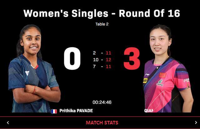 女子单打1/8决赛 钱天一 3:0 法国普利蒂卡·帕瓦德