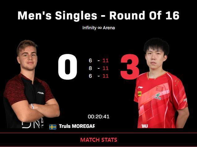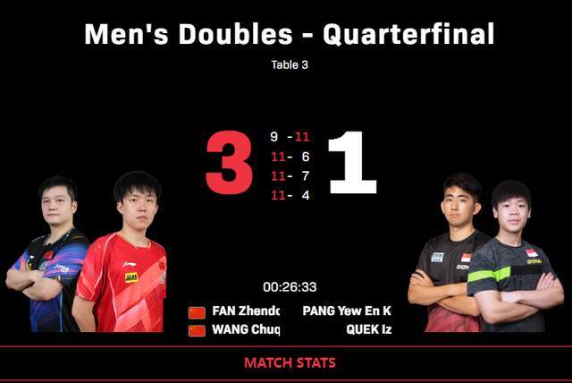 须眉双打1/4决赛 樊振东/王楚钦 3:0 新加坡冯耀恩/郭勇