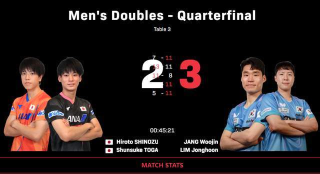 日本户上隼辅/篠塚大登 2:3 韩国林钟勋/张禹镇