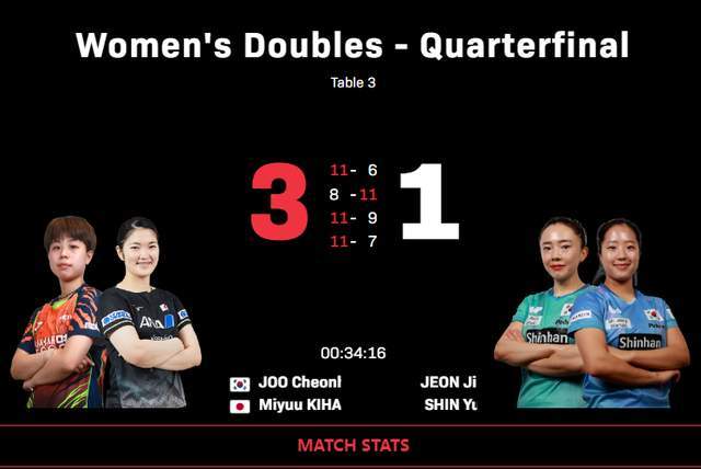 女子双打1/4决赛 日本木原好意思悠/韩国朱芊曦 3:1 韩国申裕斌/田志希