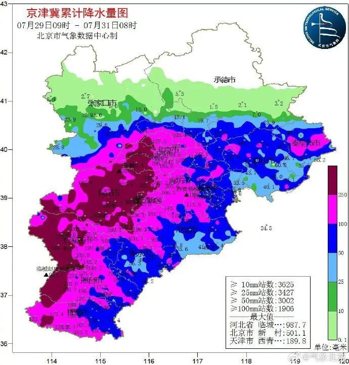 7月29日9时至31日8时,京津冀地区最大降雨出当今邢台市临城赵庄梁家庄,为987.7毫米,最大小时雨强出当今河北省邢台市内丘獐么,31日2-3时降雨110.9毫米。 皇冠2网址